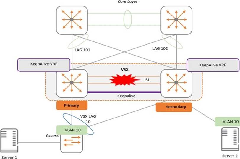 Two AOS-CX switches are configured for VSX at the access layer, where servers attached to them. An SVI interface is configured for VLAN 10 and serves as the default gateway for VLAN 10. The ISL link between the switches fails, but the keepalive interface functions. Active gateway has been configured on the switches.