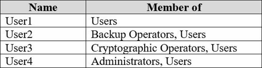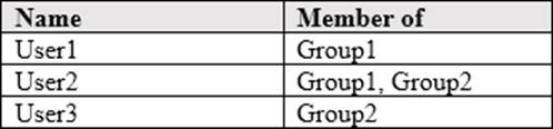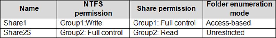 You share the folder as Share1 and assign the permissions shown in the following table.