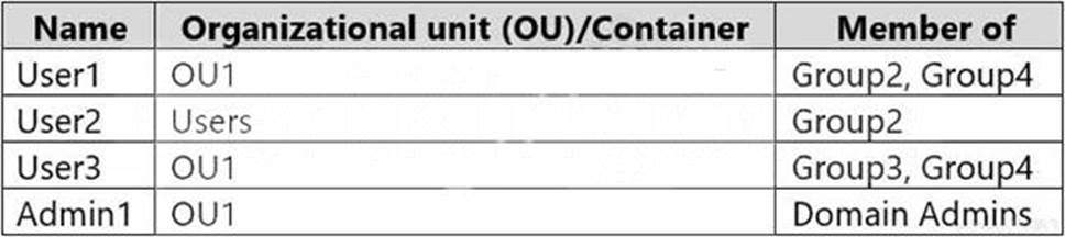 The contoso.com domain contains the users shown in the following table.