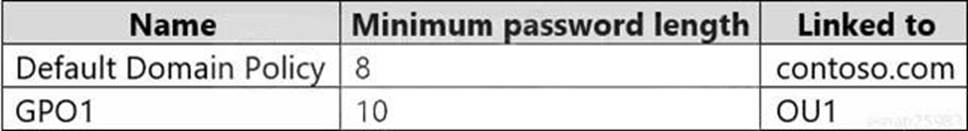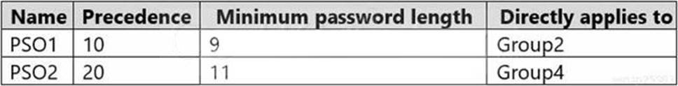 The contoso.com domain has the Password Settings Objects (PSOs) shown in the following table.