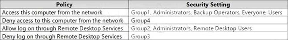 Server4 has the effective Group Policy settings for user rights as shown in the following table.