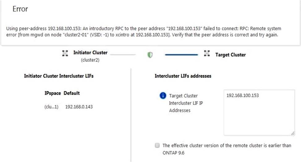 You are configuring cluster peering from cluster2 to cluster1 on your ONTAP 9.7 clusters using ONTAP System Manager. You are given the details shown below to set up the cluster peer relationship. You want to determine why the peering has failed.