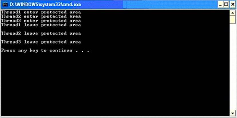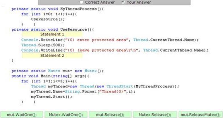 1. You work as a Software Developer for ManSoft Inc. The company uses Visual Studio .NET 2005 as its application development platform. You create an application named MyApplication using Visual C# .NET. You use the Mutex class for synchronization among threads. You create three threads to enter the protected area one by one. This means that if one thread is already in the protected area, no other thread is allowed to enter in the protected area.