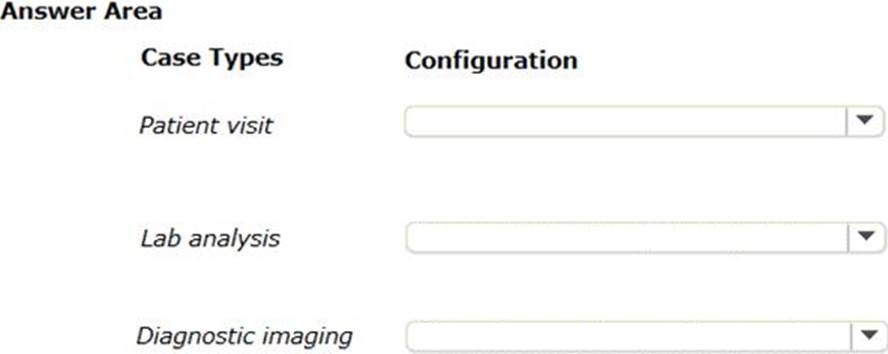 In the Answer Area, select the configurations which allow a doctor or nurse to update the parent case while lab and imaging technologists perform assignments on their respective child cases.