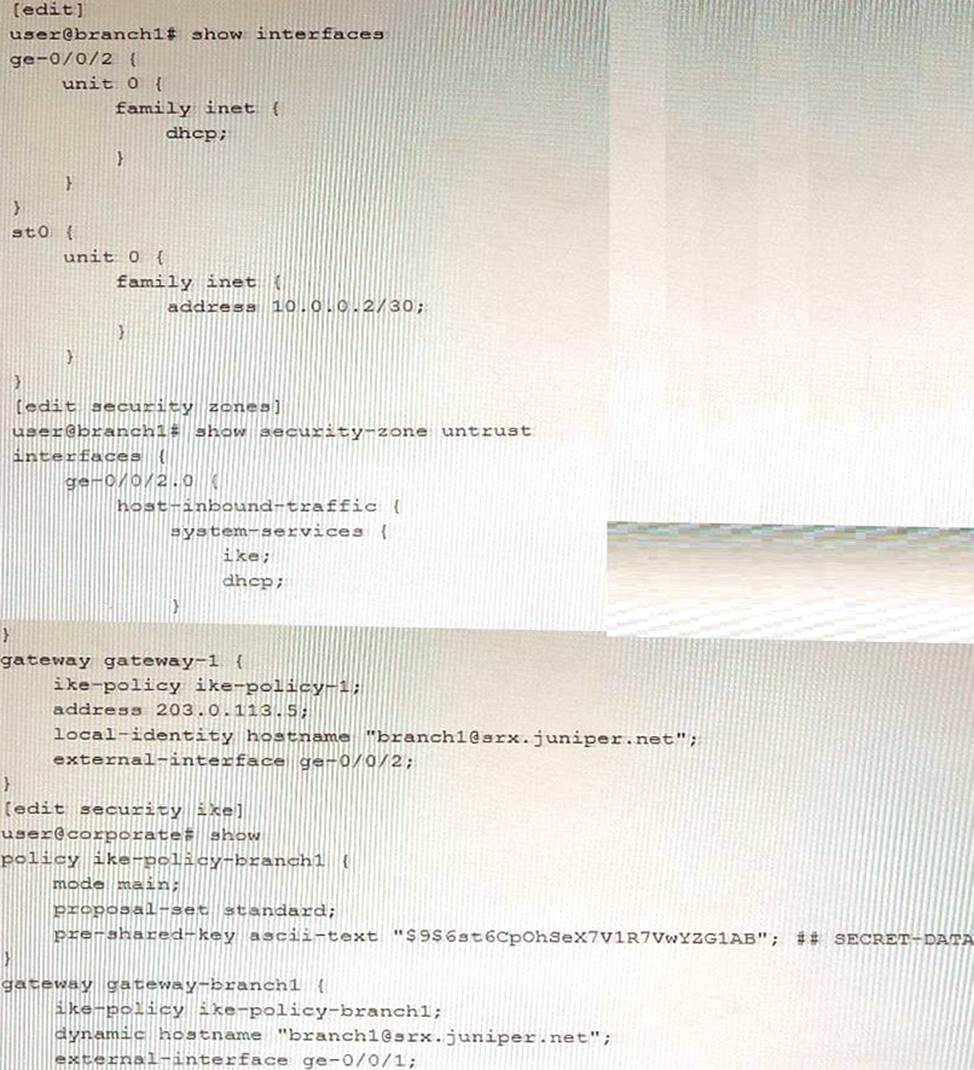 You are trying to configure an IPsec tunnel between SRX Series devices in the corporate office and branch1. You have committed the configuration shown in the exhibit, but the IPsec tunnel is not establishing.