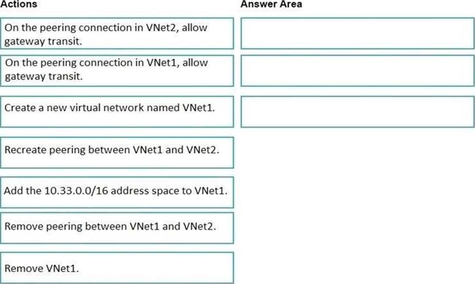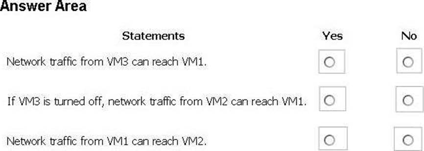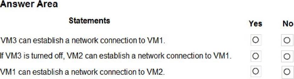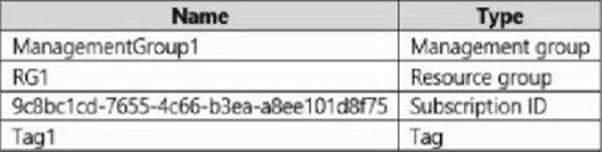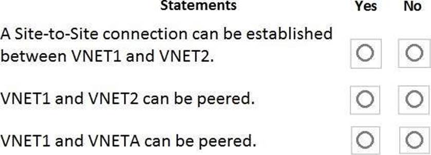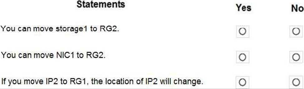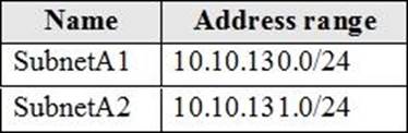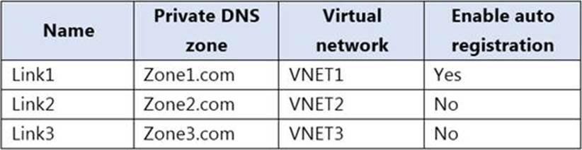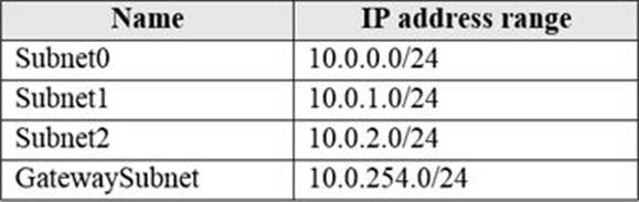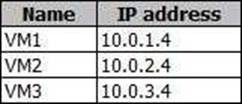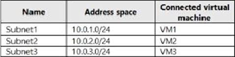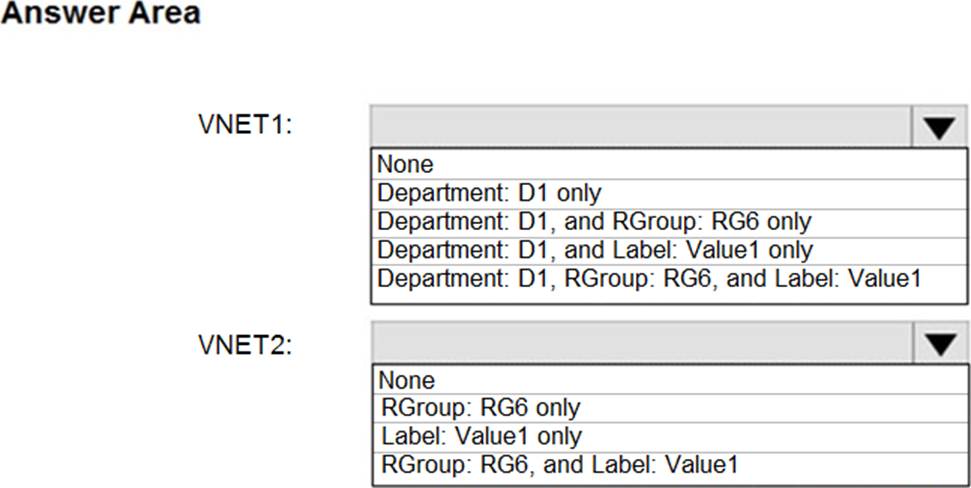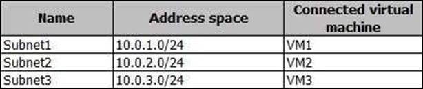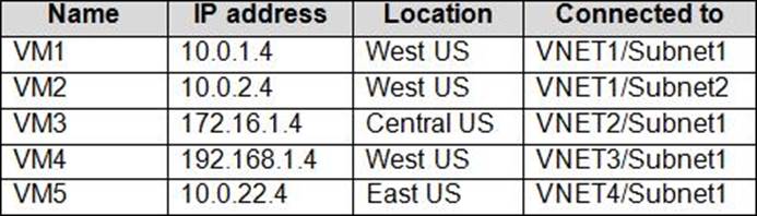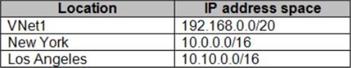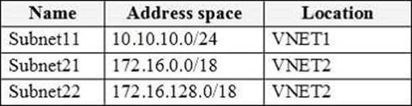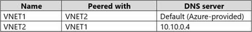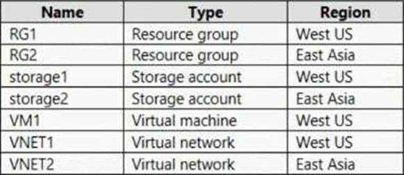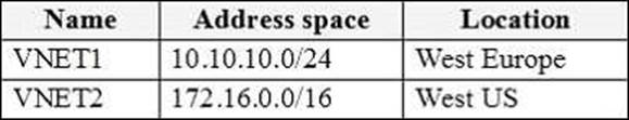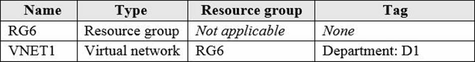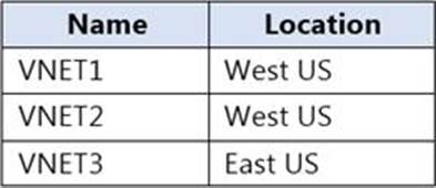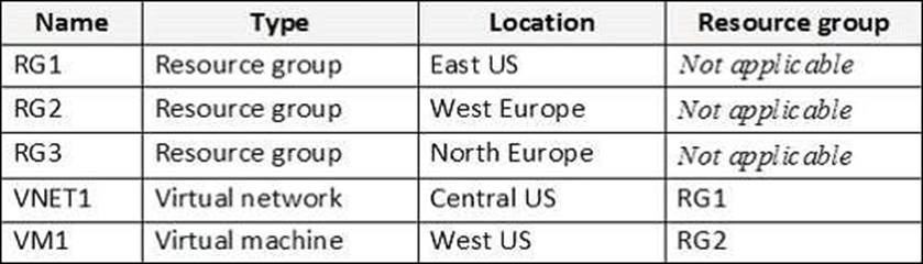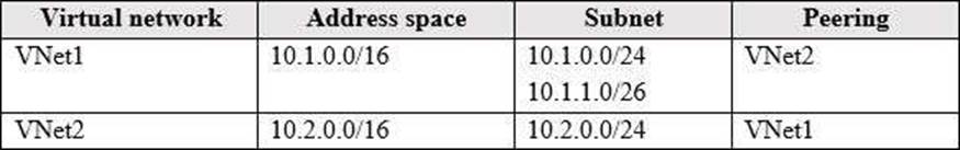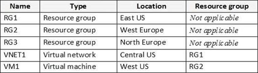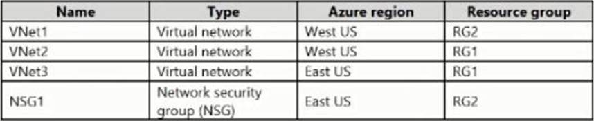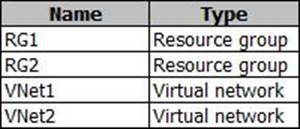 Sub1 contains two resource groups named RG1 and RG2 and the virtual networks shown in the following table.