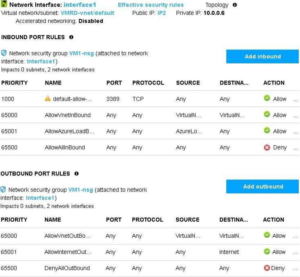No network security groups (NSGs) are associated to the network interfaces or the subnets.