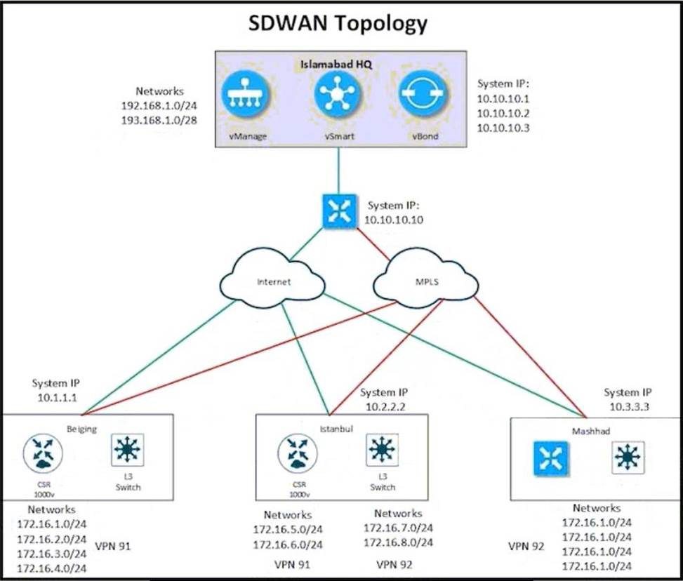The Cisco SD-WAN network is configured with a default full-mesh topology. Islamabad HQ and Islamabad WAN Edges must be used as the hub sites. Hub sites MPLS TLOC must be preferred when forwarding FTP traffic based on a configured SLA class list .